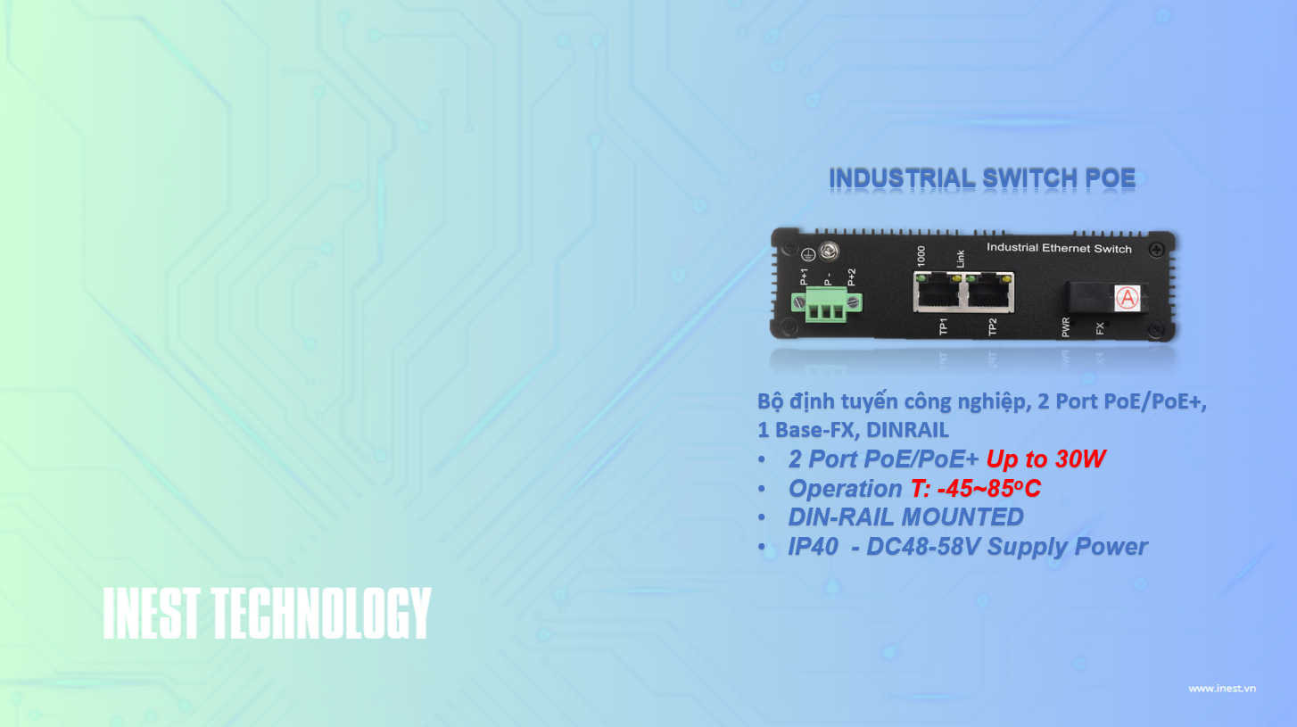 Unmanaged Industrial PoE Switch, Hỗ trợ 2 cổng 10/100/1000Base-T(X) PoE/PoE+ và 1 cổng 1000Base-FX SC connector, Multi-mode, Dual Fiber, 2KM, Din-Rail, DC48-58V, Nhiệt độ hoạt động -40-85oC |